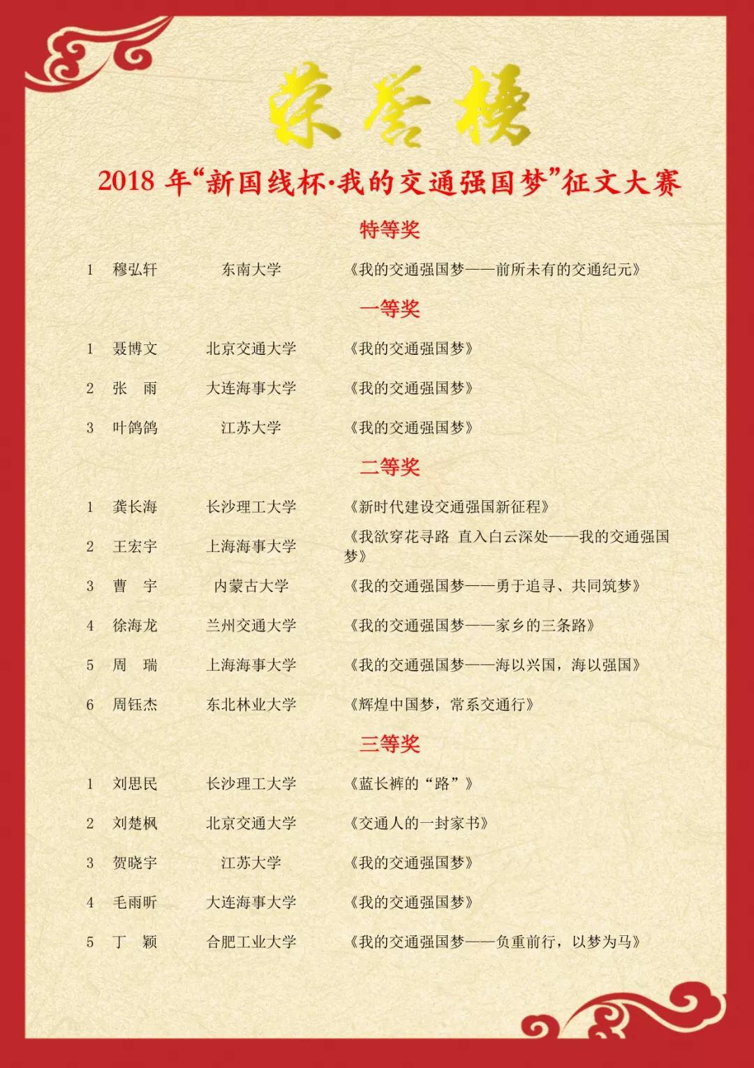 “新国线杯·我的交通强国梦”征文大赛面向全国交通类高校院(系)发出大赛通知,29所院校报送稿件142篇,评出大学生优秀论文34篇,其中特等奖1篇,一等奖3篇,二等奖6篇,三等奖24篇。