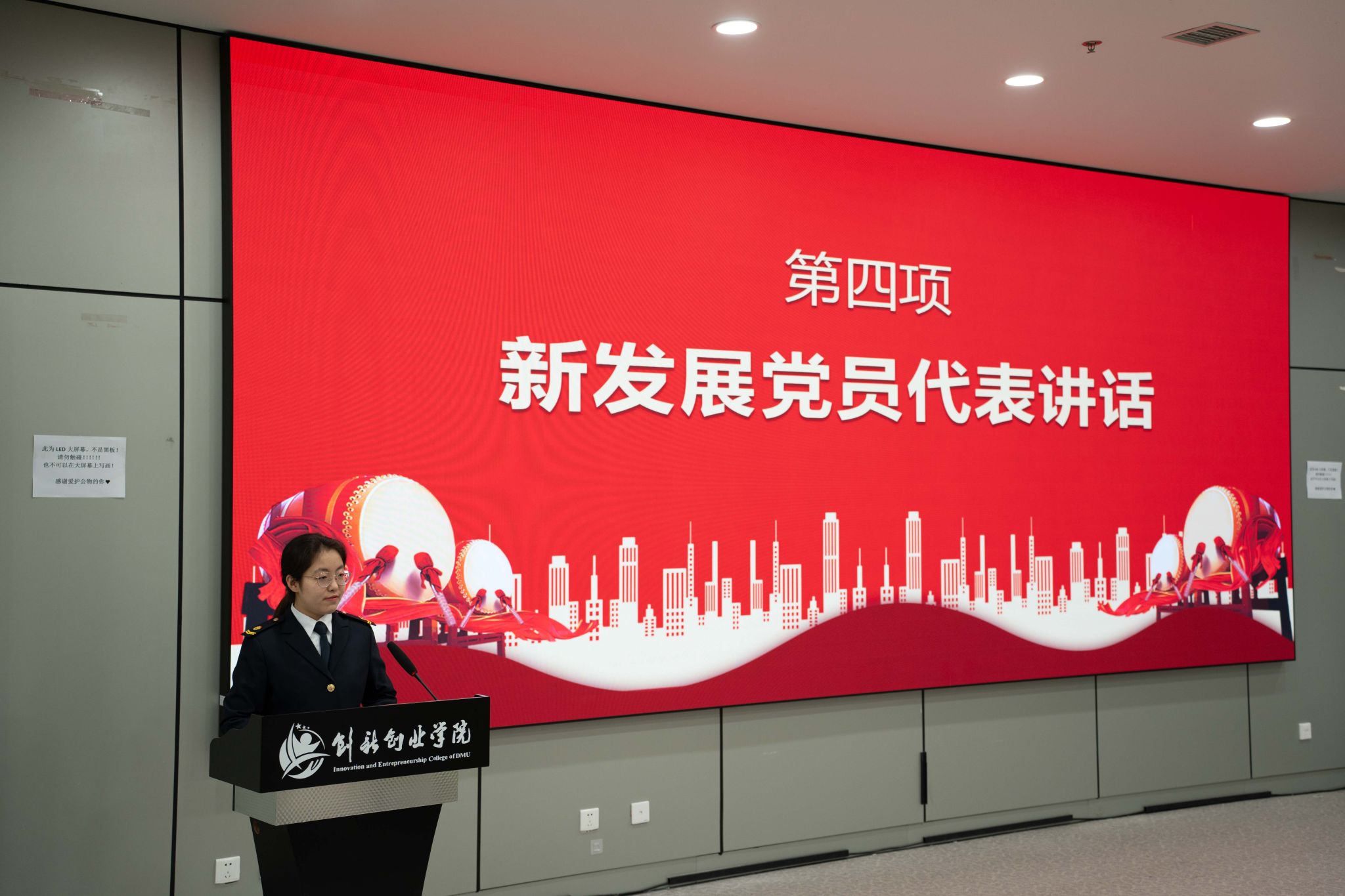 新发展党员代表船舶电气工程学院电气工程及其自动化专业学生党支部郝婉婷同志发言,结合自身成长和当代青年的责任担当,表示无论是在专业学习、科研创新还是在社会服务中,都应以实干兴邦的姿态,以青春擘画未来,以行动践行初心。