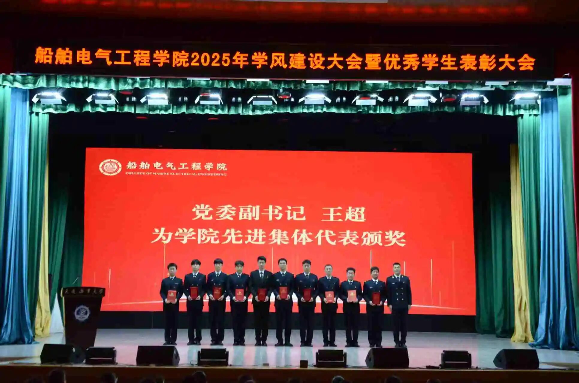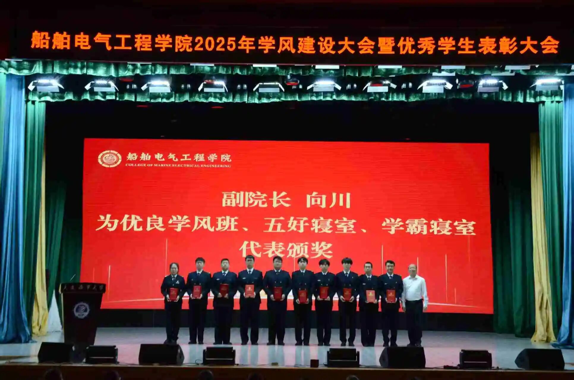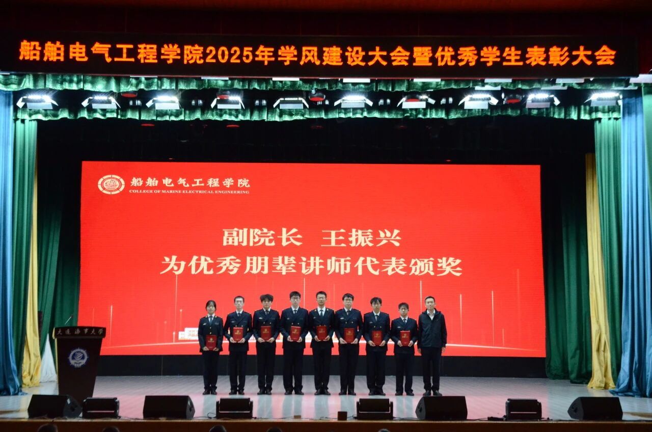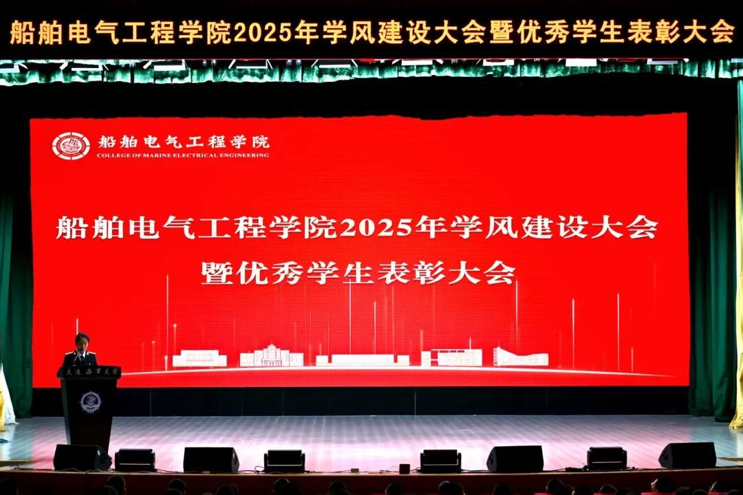 为落实立德树人根本任务,进一步规范学生日常教育和管理,营造优良学风氛围,激发学生奋进热情,10月15日,船舶电气工程学院在东山礼堂召开2025年学风建设大会暨优秀学生表彰大会。船舶电气工程学院院长彭周华,党委书记张术佳,副院长向川,副院长王振兴,党委副书记、副院长、纪委书记王超,半军事管理大队副大队长丁学军,教师代表赵红老师出席大会,全体学生工作干部,2025级全体本科生,2023、2024级学生代表参会。会议由学院团委书记黄碧珍主持。