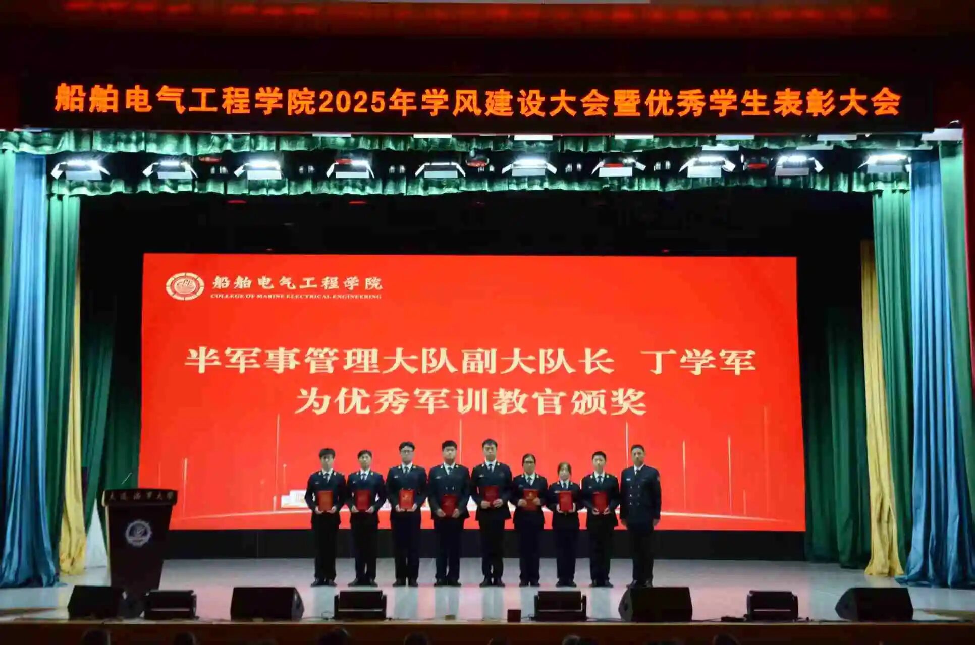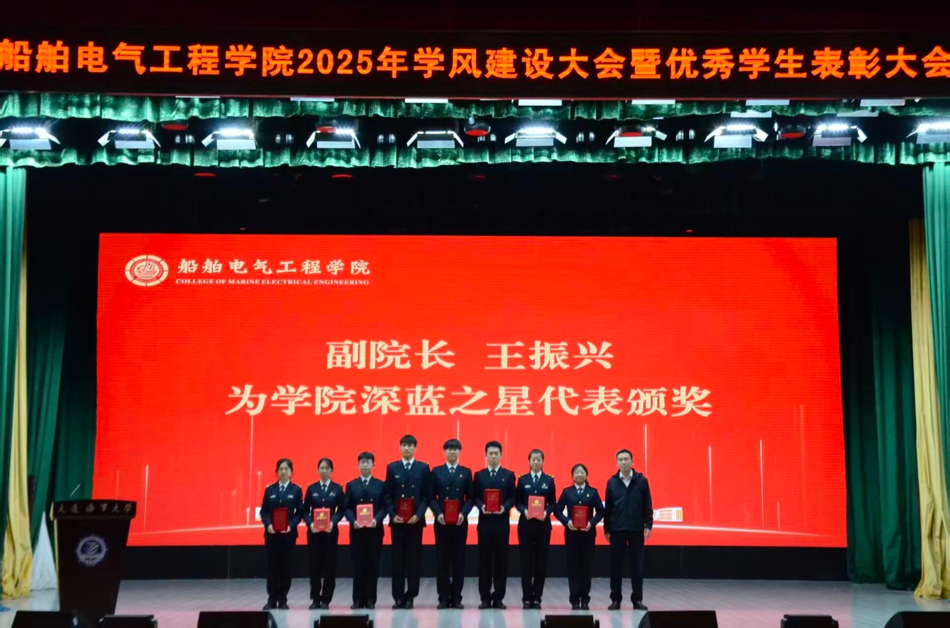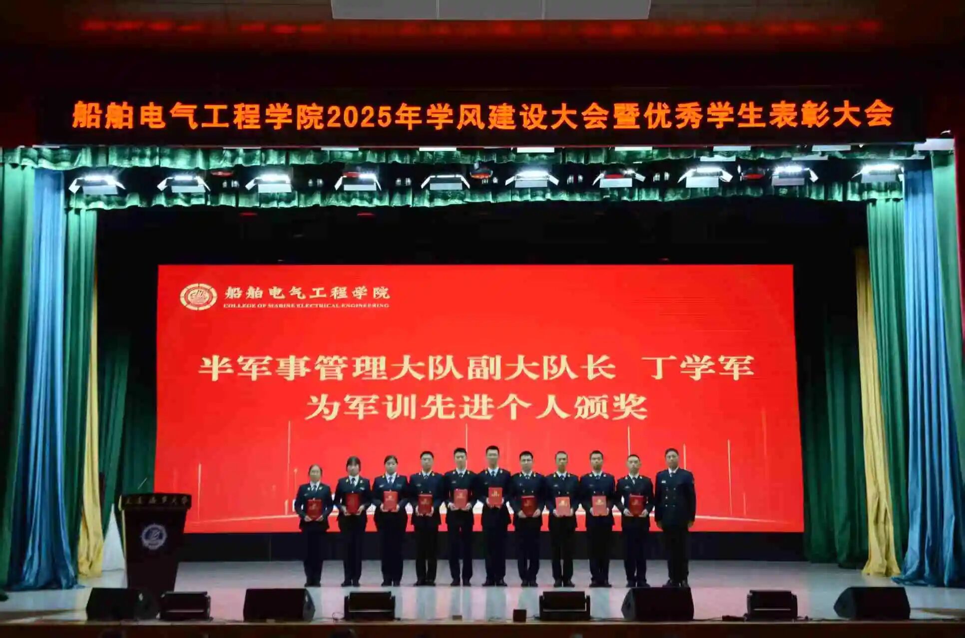 为落实立德树人根本任务,进一步规范学生日常教育和管理,营造优良学风氛围,激发学生奋进热情,10月15日,船舶电气工程学院在东山礼堂召开2025年学风建设大会暨优秀学生表彰大会。船舶电气工程学院院长彭周华,党委书记张术佳,副院长向川,副院长王振兴,党委副书记、副院长、纪委书记王超,半军事管理大队副大队长丁学军,教师代表赵红老师出席大会,全体学生工作干部,2025级全体本科生,2023、2024级学生代表参会。会议由学院团委书记黄碧珍主持。