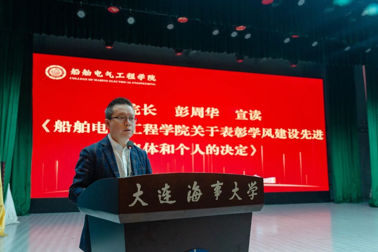 院长彭周华宣读《船舶电气工程学院关于表彰2024-2025学风建设先进集体和个人的决定》。他们以共同追求汇聚个体微光,用正向氛围带动彼此进步,凭严谨班风引领学业共进,以温馨环境打造生活港湾。