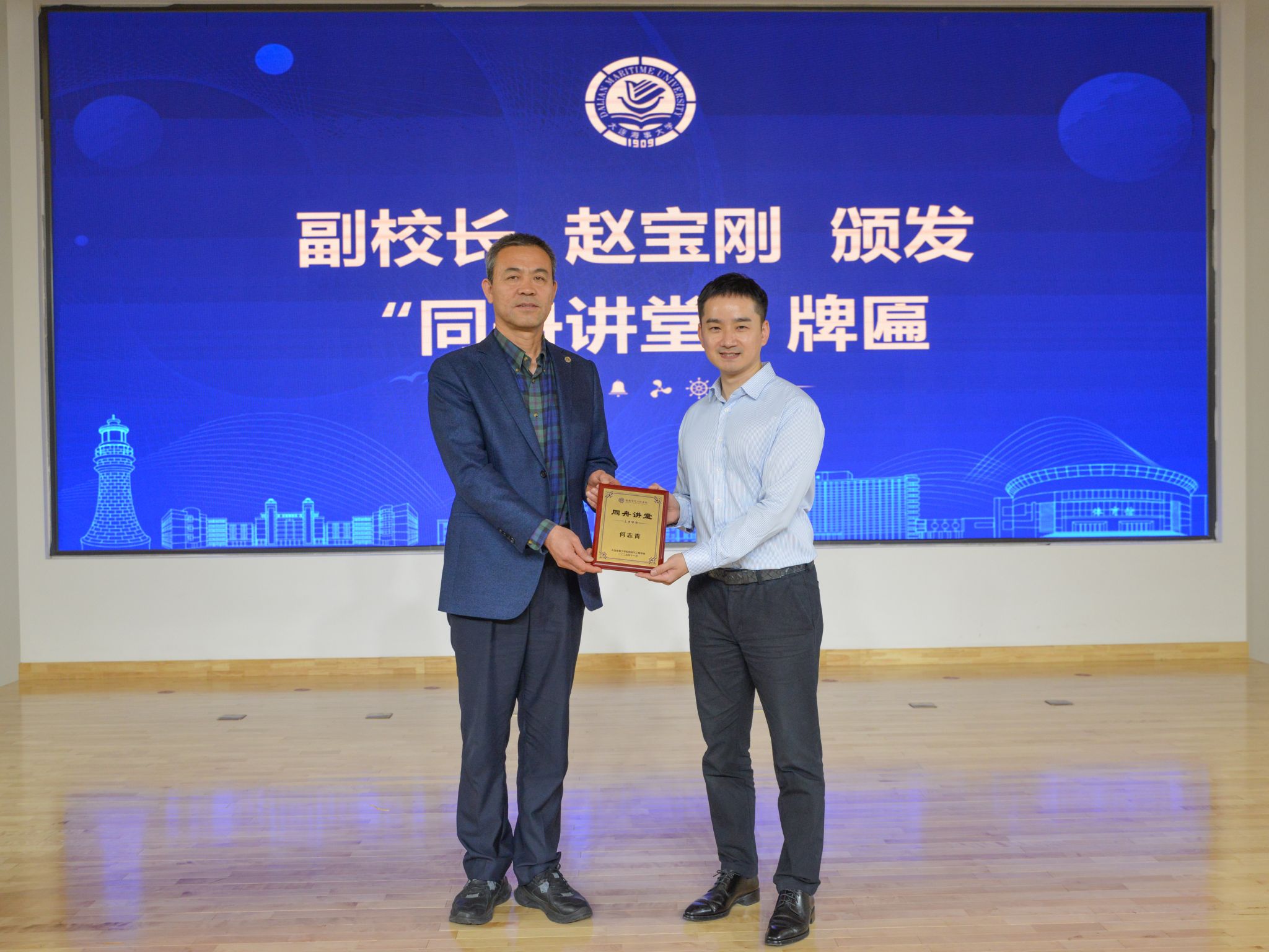 为感谢何志青校友对母校育人工作的支持,副校长赵宝刚代表学校为何志青校友颁发“海大讲坛”牌匾与船舶电气工程学院“同舟讲堂”纪念牌匾。两块牌匾不仅承载着母校与校友之间的深厚情谊,也象征着知识与精神的薪火相传。