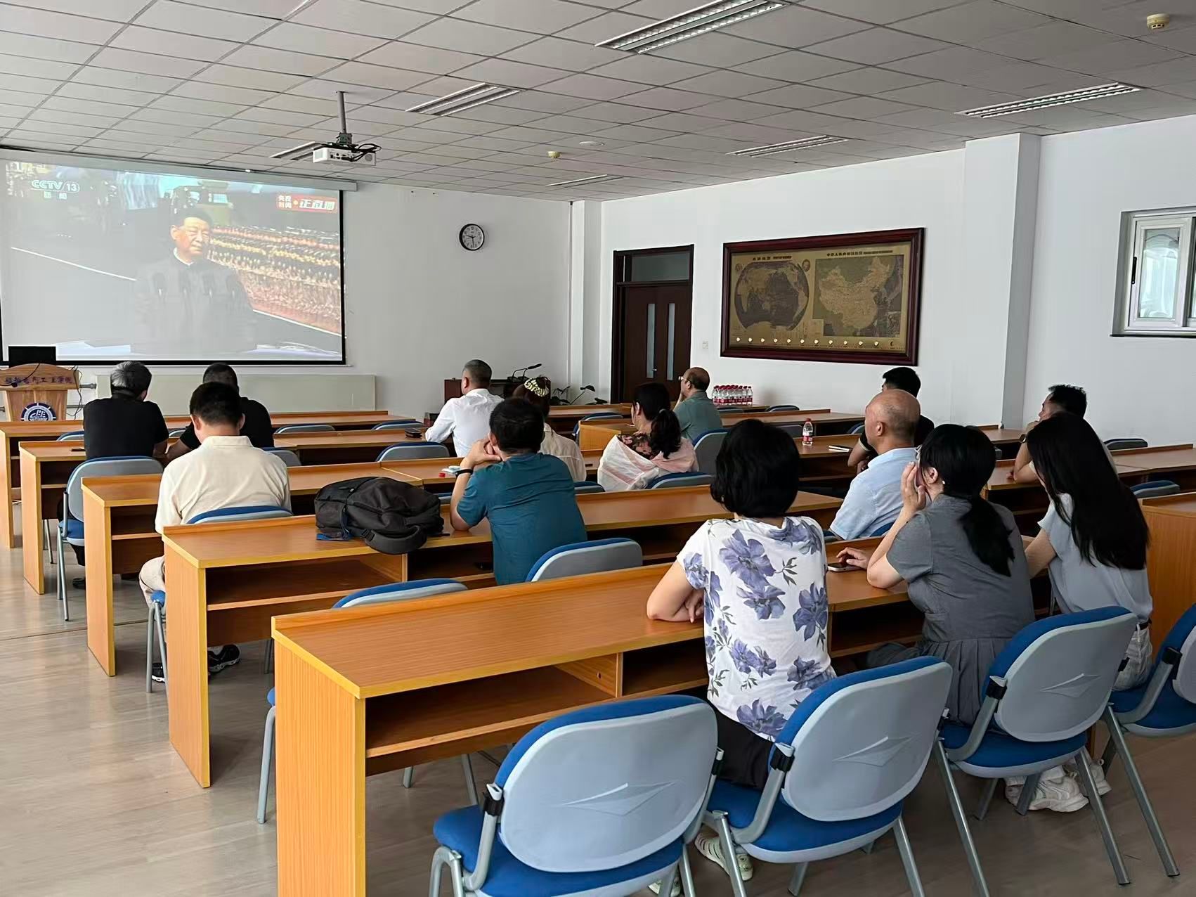 为深刻铭记中国人民抗日战争暨世界反法西斯战争胜利八十周年的重大历史意义,传承红色基因,凝聚奋进力量,9月4日,党委书记张术佳带领学院领导班子成员、高层次人才代表、青年教师代表齐聚船电楼306,集中观看抗日战争暨反法西斯战争胜利八十周年纪念活动,共同回望那段浴血奋战、气壮山河的光辉岁月。活动现场,气氛庄重而热烈。随着视频的播放,一幅幅定格历史的珍贵画面、一段段震撼人心的纪实影像,生动再现了中国人民在抗日战争中同仇敌忾、视死如归的英雄气概,展现了中华民族为世界反法西斯战争胜利作出的巨大牺牲和卓越贡献。会后,张术佳书记作了总结讲话,从师德师风建设的核心要求出发,对全体教师进行了深刻的思想教育和价值引领。