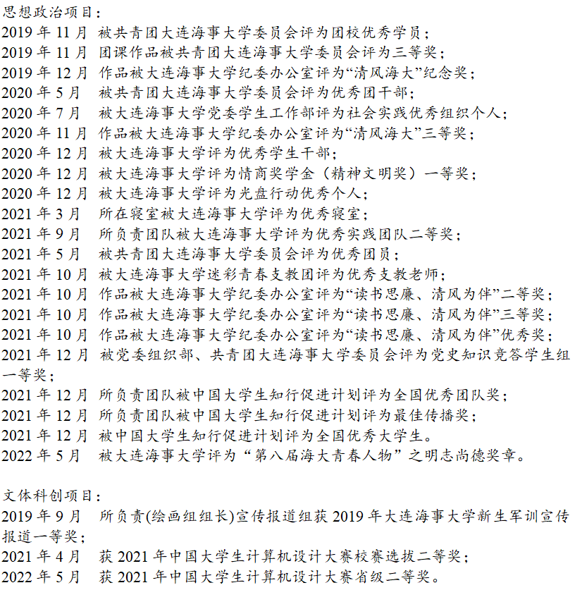 出于对党团工作的热爱,该生从大一开始就参与团员工作,在团总支书记的领导下和13个团支部携手共进,团总支两年评为五星、四星团(总)支部,2020年获评大连海事大学红旗团总支,总支内半数团支部获评市、校级红旗团支部,该生于大一加入学生会,即使疫情期间也不间断同学服务,大三因政治基础过硬,能较好把控政治思想,从学生会调至分团委任学生副书记,期间积极贯彻落实上级领导方针,积极带领9个团总支,83个团支部,总计2664余位同学学习红色思想。配合团委书记进行团委、学生会改革工作,带头整理并修订100余页32250字“智慧团建使用指南”,取得了学院和同学们认可的成绩,2022年5月所带领的船舶电气工程学院团委被评为示范类学生社团。