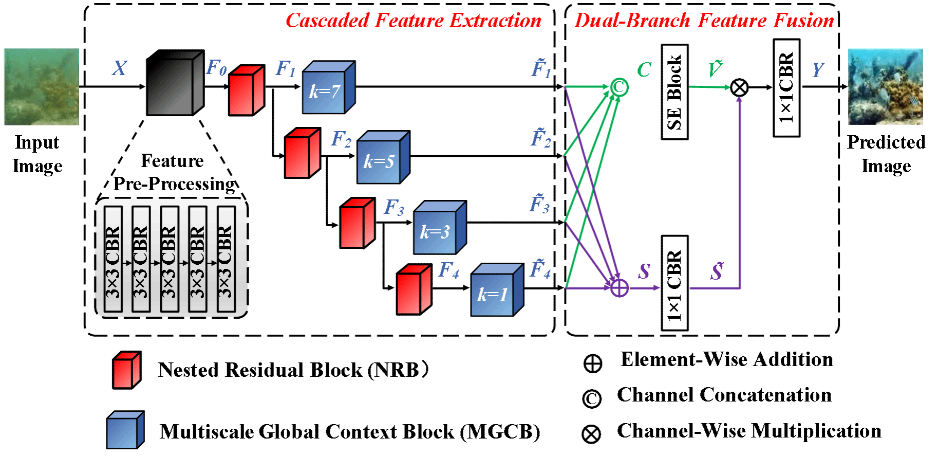 本研究针对水下环境所存在的成像模糊、色彩偏移、低能见度等视觉退化问题开展研究,并尤其从高实时性的角度,提出一种可快速部署实施的深度神经网络CFENet。该网络主要采用一种简单有效的级联特征提取架构,旨在借助极简嵌套残差块以及多尺度全局上下文块以实现对视觉退化图像特征的高效表征;另一方面,CFENet还通过双分支特征融合架构以实现对图像高级特征与低级特征的快速融合,进而以极低的计算负载保证视觉感知增强图像的快速生成。通过与前沿工作对比表明,本研究在多种视觉感知增强评估指标中取得优异结果的同时,其复杂度与仅包含10层卷积层的深度神经网络模型几乎持平。