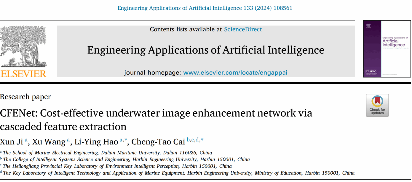 针对水下视觉感知增强问题,大连海事大学船舶电气工程学院郝立颖教授团队在《Engineering Applications of Artificial Intelligence》(EAAI)发表题为“CFENet: Cost-effective underwater image enhancement network via cascaded feature extraction”的科技论文。EAAI为人工智能领域权威期刊,最新影响因子7.5,现属于中科院1区Top期刊。