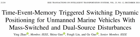 针对受多源海洋干扰影响的无人船动力定位问题,大连海事大学船舶电气工程学院赵颖副教授在《IEEE Transactions on Intelligent Transportation Systems》发表题为“Time-event-memory triggered switching dynamic positioning for unmanned marine vehicles with mass-switched and dual-source disturbances”的科技论文。该期刊为智能交通领域顶级期刊,最新影响因子7.9,现属于中科院1区Top期刊。