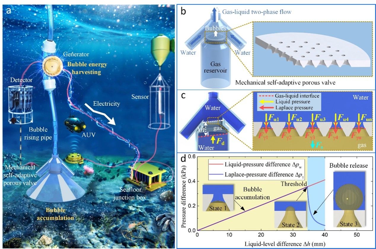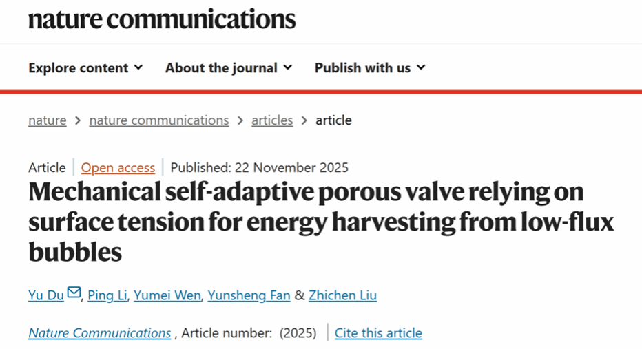 针对海底超低通量气泡能量难以被有效收集的问题,大连海事大学船舶电气工程学院讲师杜宇提出了一种力学自适应多孔阀气泡无源控制方案,相关论文“Mechanical self-adaptive porous valve relying on surface tension for energy harvesting from low-flux bubbles”(依靠表面张力的力学自适应多孔阀用于从低通量气泡中收集能量)于2025年11月22日在Nature Communications期刊在线发表(图1,DOI: https://doi.org/10.1038/s41467-025-66500-6)。